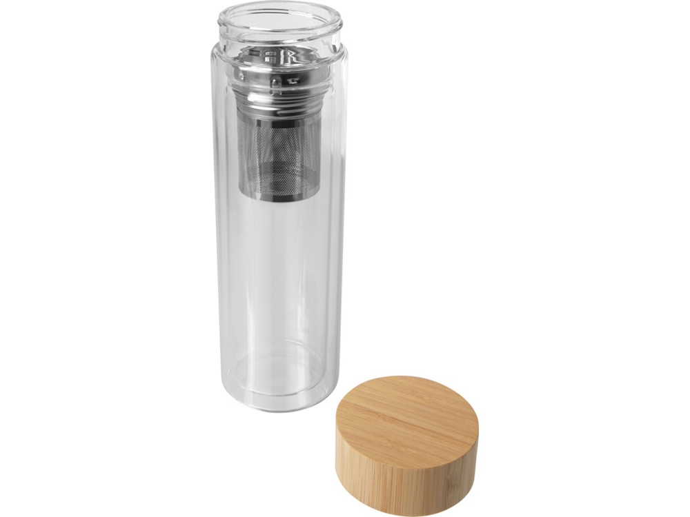 Бутылка для воды из боросиликатного стекла с двойными стенками, заварником для чая и бамбуковой крышкой. Используемый бамбук поступает из устойчивых, экологически чистых и социально ответственных источников. Объем: 400 мл. Поставляется в коробке из переработанного картона. Borosilicate glass.