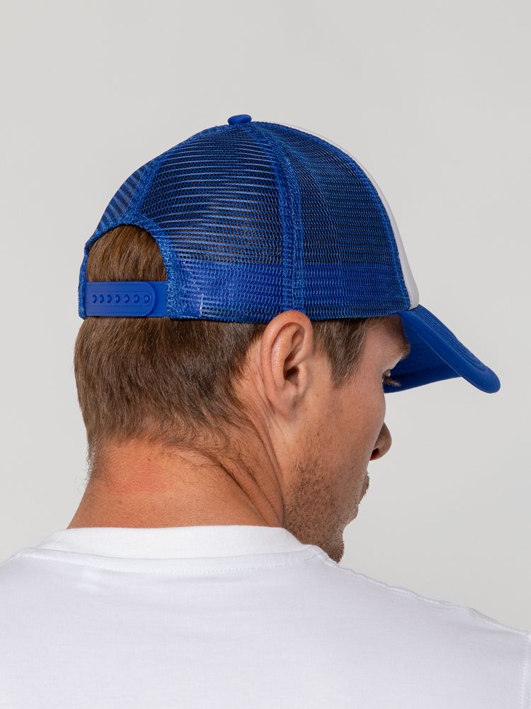 Стандартная модель с 5 клиньями без лобового шва в нестандартном исполнении. Передний клин и козырек выполнены из полиэстера с наполнителем из поролона, боковые и задние клинья — из сетки. Размер регулируется с помощью пластиковой застежки.