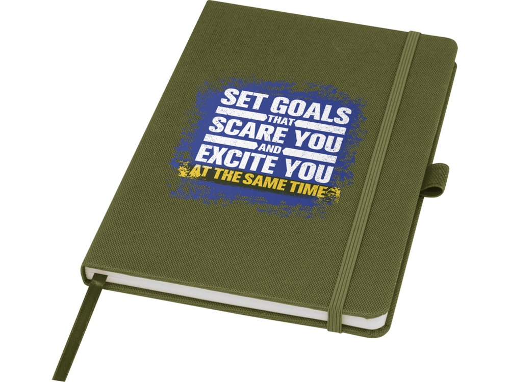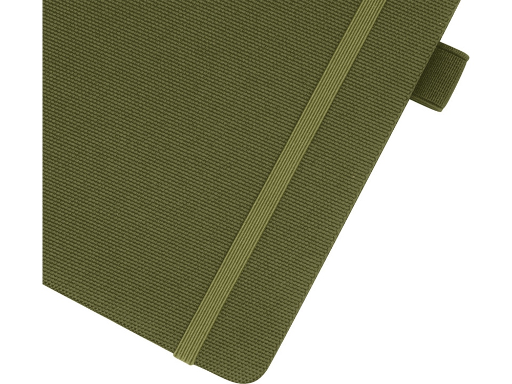 Блокнот формата А5 с обложкой из переработанного ПЭТ. Содержит 80 листов в линию плотностью 70 г/м², изготовленных из переработанной бумаги, с петлей для ручки и лентой-закладкой. Может быть дополнен шариковой ручкой Honua 107757 из переработанного ПЭТ. Переработанный PET пластик. FSC Recycled 100% P7 CU-COC-877277.