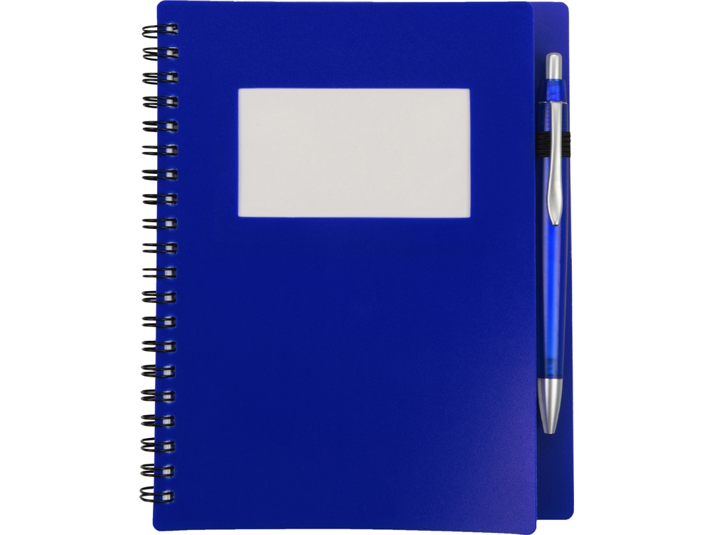 Блокнот Контакт в полипропиленовой обложке переплетен на пружине. В обложке блокнота предусмотрено окошко, в которое можно поместить визитную карточку или полиграфическую вставку. В комплекте с блокнотом идет ручка, которая вставляется в петельку сбоку. Размер окошка внешний 8,4 х 4,8 см, внутренний 10 х 6,5 см.
