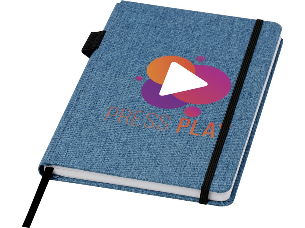 Блокнот формата А5 с отделкой из переработанного ПЭТ. Содержит 96 листов в линию плотностью 70 г/м², изготовленных из переработанной бумаги, с петлей для ручки и лентой-закладкой. В упаковке из картона. Recycled Plastic, Переработанная бумага. #?0:>2:0: FSC Recycled 100% P5.1 CU-COC-877277. FSC Recycled 100% P7.1 CU-COC-877277.