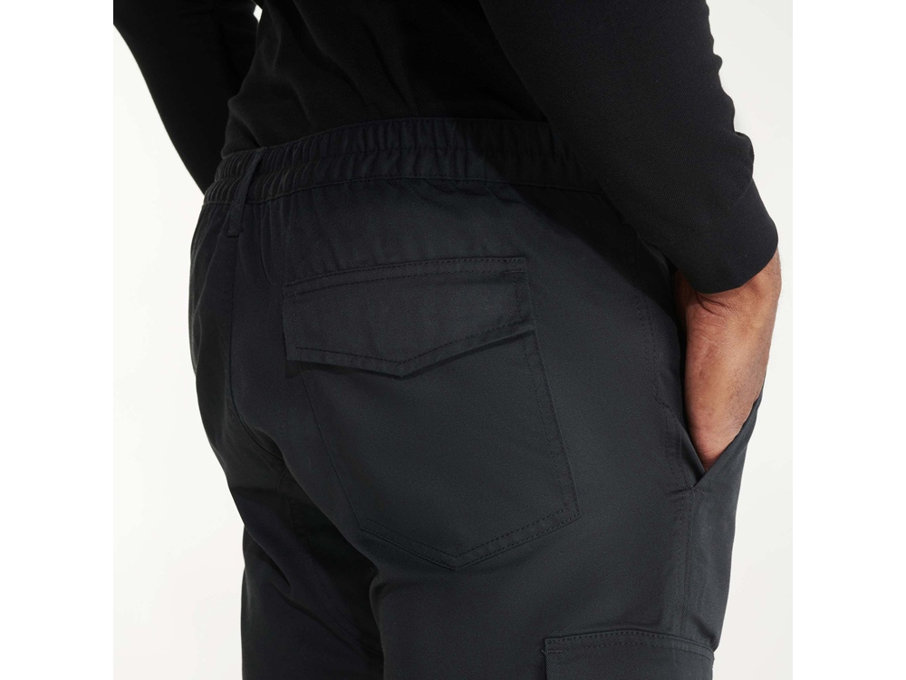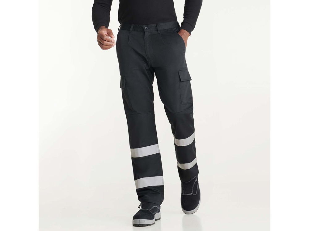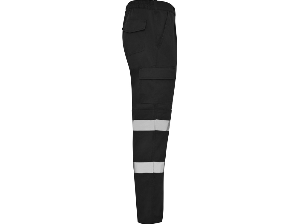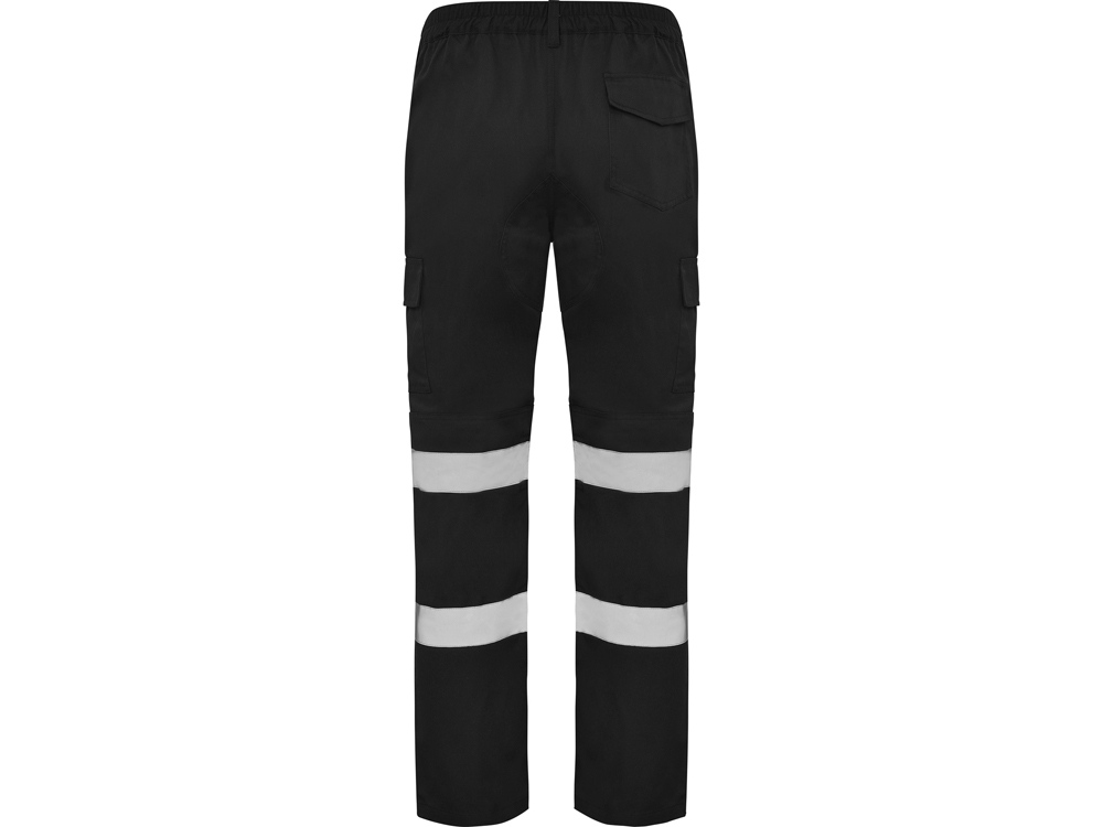 Брюки из прочной ткани. 1. Регулируемый эластичный пояс сзади. 2. Два кармана спереди. 3. Функциональный карман сзади с клапаном на липучке. 4. Два боковых карманы с клапаном на липучке. 5. Дополнительное усиление сзади для защиты от протирания при сидении. 6. Двойная ткань на коленях. 7. Две горизонтальные светоотражающие полосы.