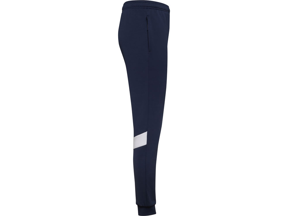 Спортивные брюки с эластичным поясом и шнурком. Боковые карманы закрываются на молнию. Контрастные лампасы белого цвета. Низ с манжетами из риба 1х1. Может быть с комбинирован с курткой Leros.