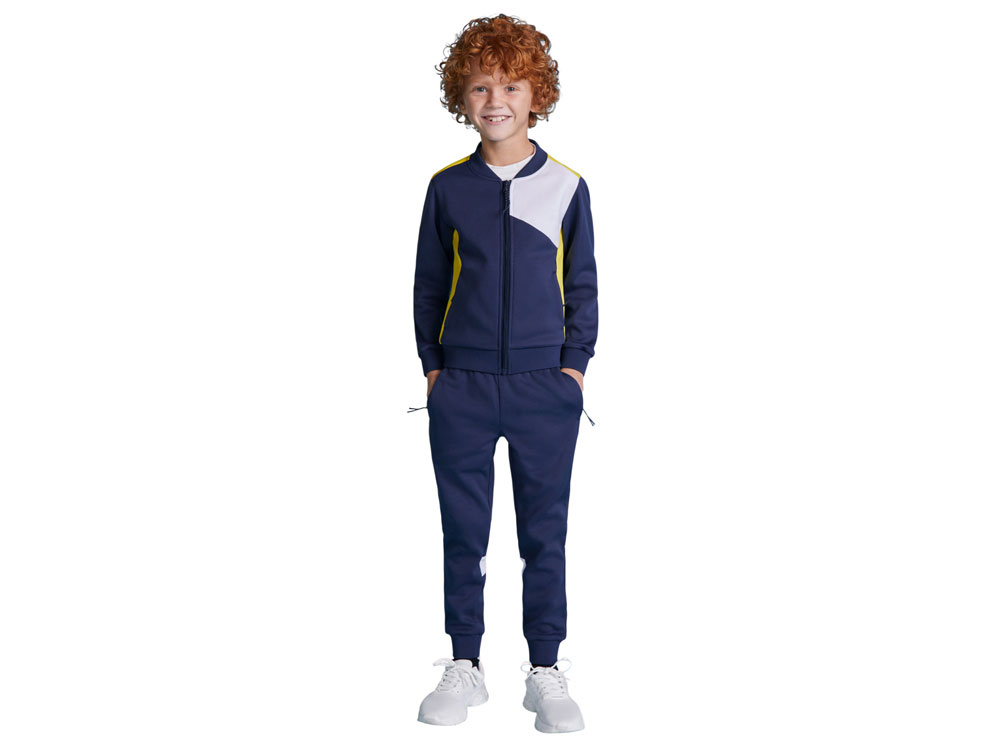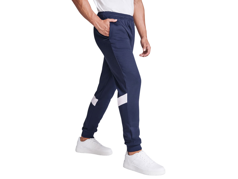 Спортивные брюки с эластичным поясом и шнурком. Боковые карманы закрываются на молнию. Контрастные лампасы белого цвета. Низ с манжетами из риба 1х1. Может быть с комбинирован с курткой Leros.