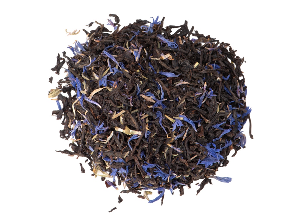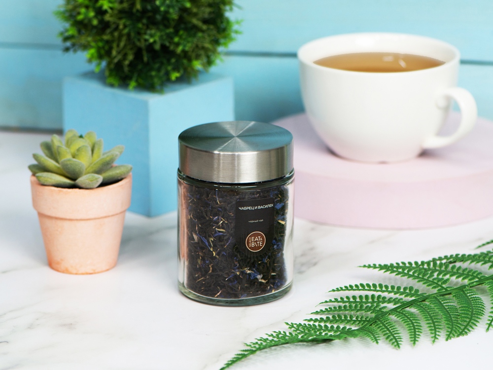 Чай черный, серия Essence, с чабрецом и лепестками василька, стеклянная банка купить оптом и в розницу с нанесением логотипа в Казани