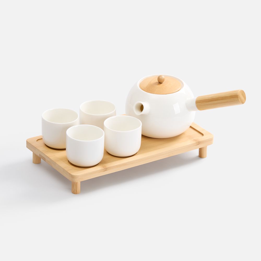 Материал чайник, чашки - фарфор; поднос, крышка и ручка у чайника - бамбук
