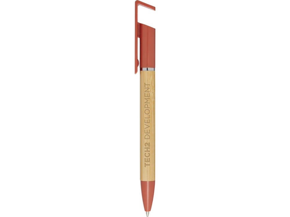 Бамбуковая шариковая ручка, которая также может служить подставкой для телефона. Кнопка и среднее кольцо изготовлены из переработанного пластика, наконечник — из латуни, а корпус — из бамбука, полученного из ответственных источников. Цвет чернил: синий. Длина непрерывной линии: 1000 метров. Размер пера: 1,0 мм. FSC certified bamboo. FSC Mix Credit N5 CU-COC-877277.