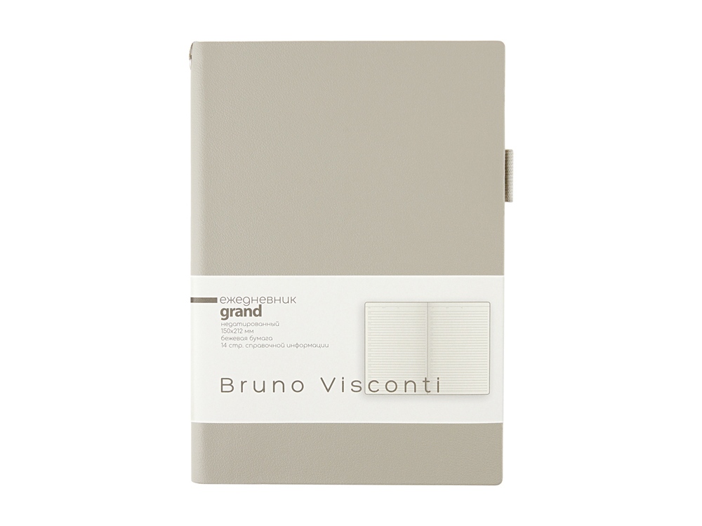 Мягкая, гибкая обложка с необычной фактурой, приятной на ощупь, петля под ручку, двойное ляссе, стандартный формат А5 — все это ежедневник Grand. А благодаря оригинальному способу фиксации ляссе на корешке ежедневник получил новое звучание. Такая фишка придется по вкусу всем, кто придает большое значение деталям. Недатированный блок изготовлен из бежевой бумаги плотностью 80 г/кв.м. Ежедневник имеет справочную информацию на 14 страницах.
