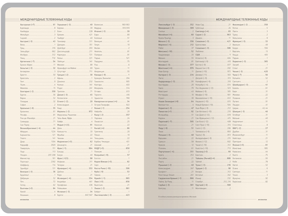 Недатированный ежедневник Megapolis Flex Nebraska формата А5 - идеальный помощник в деле планирования рабочего времени для тех, кто ценит рационализм и функциональность. Гибкая (flex) обложка из искусственной кожи с благородной глянцевой поверхностью и практичный книжный переплет надежно предохраняют блок от механических повреждений. Закругленные углы блока и обложки - верх утилитарности и одновременно икона стиля. Ничего лишнего, ни одной необоснованной детали, и при этом сколько элегантности! Внутренний блок выполнен из бежевой бумаги плотностью 70 г/кв.м и имеет разделы: • для планирования с линовкой и указанием времени с интервалом в один час; • страница для персональных данных; • справочная информация на 19 страницах (аэропорты Европы, штрихкоды, международные телефонные коды, цифровые автомобильные коды, энергетическая и питательная ценность продуктов, национальные и религиозные праздники, единицы измерения, страны мира, размеры одежды, форматы бумаги и др.); • телефонная книга на 19 страницах.