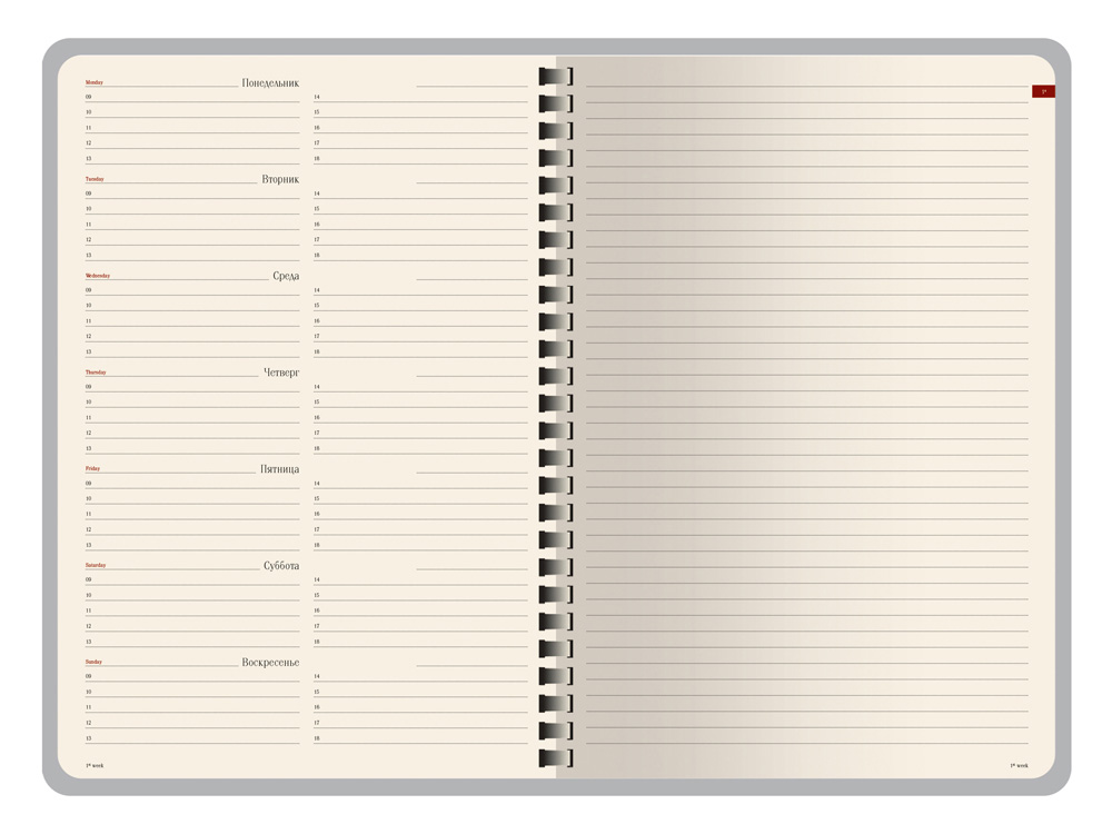 Деловые еженедельники Concept - это воплощение современного дизайна, в котором сочетаются практичные детали. Благодаря удобному формату slim-pocket еженедельник легко помещается в сумку. Еженедельник Concept в классической серой обложке формата А5. Практичный, привлекательный и приятный на ощупь материал обложки на протяжении всего срока службы сохраняет презентабельный вид. Уголки обложки имеют закругленную форму, по всему периметру сделана прострочка нитками в тон. Недатированный блок состоит из 128 страниц, укреплённых на пластиковом полускрытом гребне. На 21 странице размещена справочная информация на русском языке. День недели указан на русском и английском языках. Блок является сменным и вставляется внутрь обложки. С внутренней стороны обложка имеет вырубные отделения для визиток и кредитных карт, а также петлю для ручки на резинке. Для хранения чеков, записок и бумаг внутри расположен прозрачный пластиковый конверт.