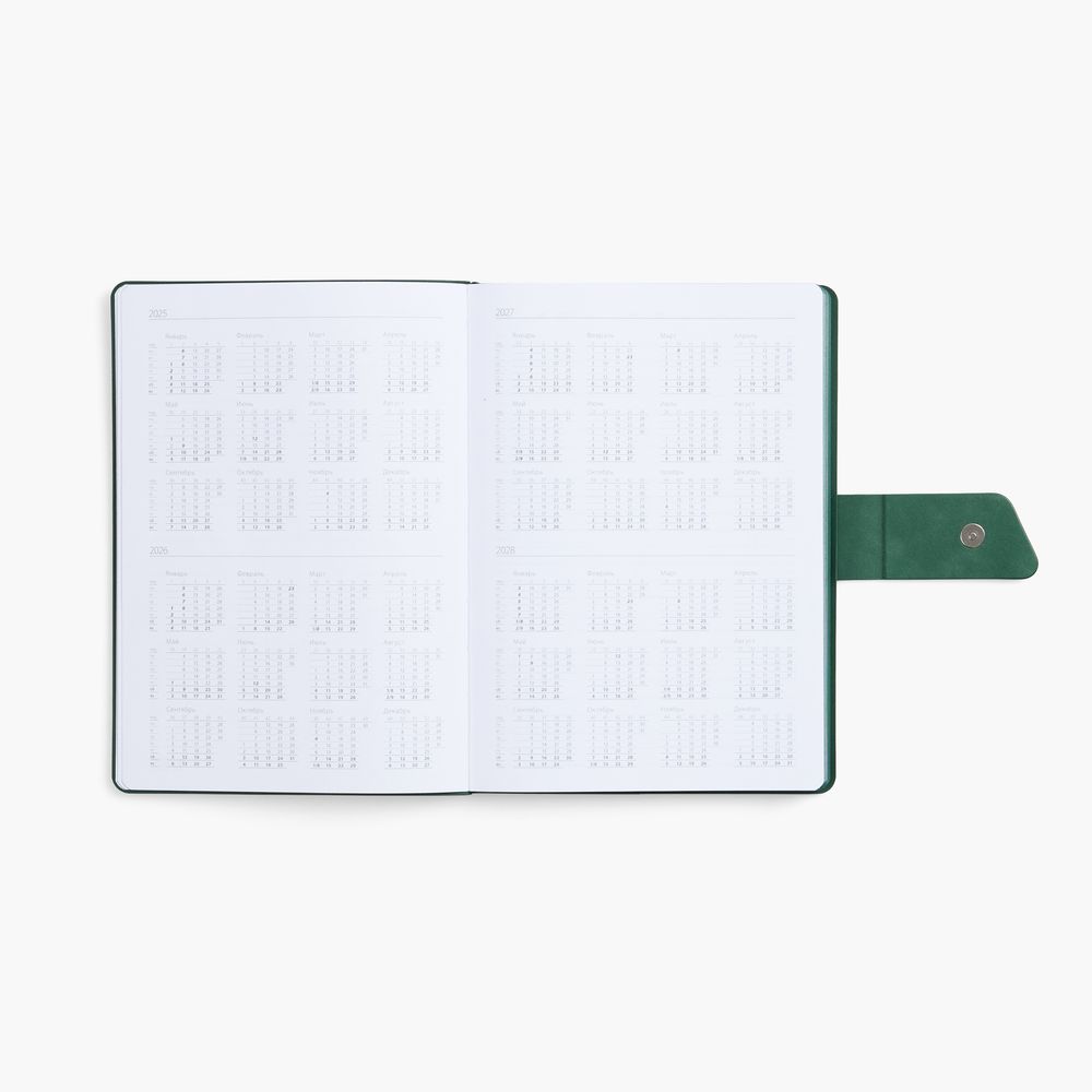 Ежедневник с гибкой обложкой, выполнен из материала La Fite, черный АА и NubuckTouch, зелёный, дополнен зеленым ляссе и хлястиком на кнопке.