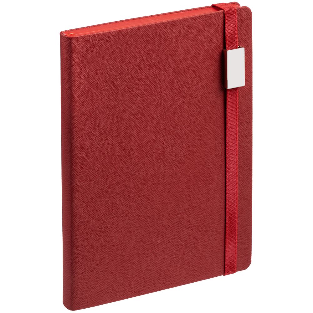 Ежедневник с полутвердойобложкой выполнен из материала Nice Touch, красный PP, и дополнен резинкой шириной 1 см с металлическим шильдом и ляссе красного цвета.