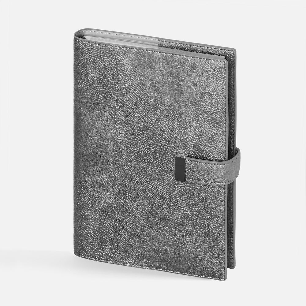Ежедневник в мягком переплете со съёмная обложкой, дополнен застёжкой-хлястиком  с металлическим шильдом на кнопке, двойным ляссе и капталом.