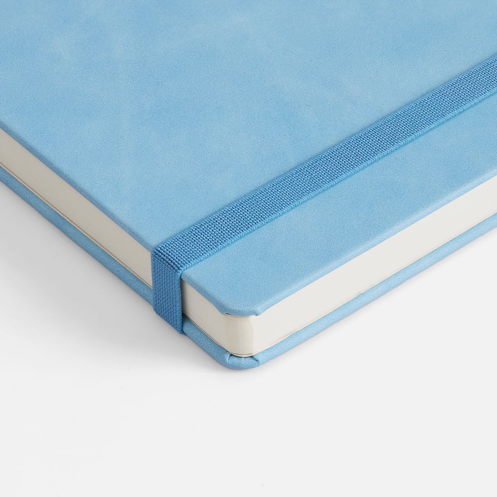 Ежедневник с твердой обложкой, выполнен из материала Nubuck Touch, голубой JJ, дополнен ляссе светло-голубого цвета.