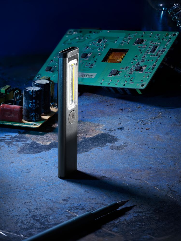 Плавная регулировка яркости осуществляется удержанием центральной кнопки при включенном устройстве — это позволяет точно адаптировать освещение под рабочие условия. Магнит в основании фонарика дает возможность зафиксировать фонарик на металлической поверхности и освободить руки для выполнения задач.
