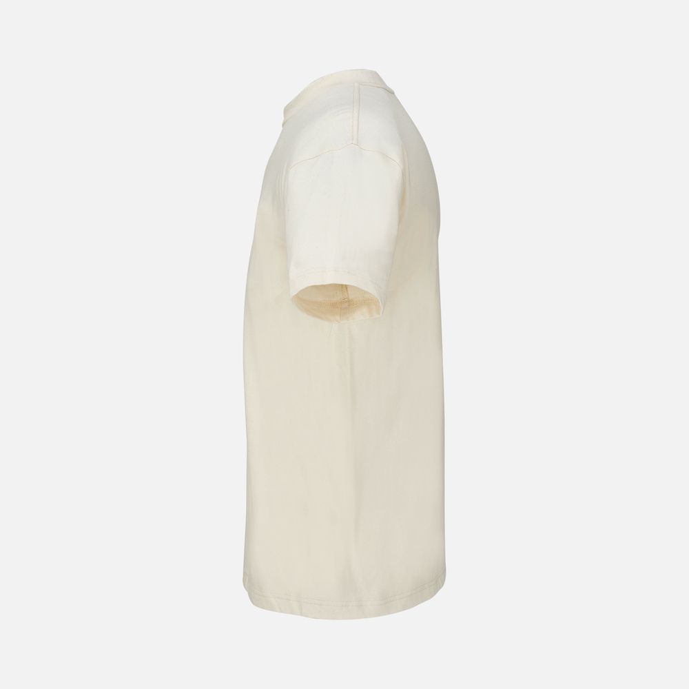 Ткань хорошо держит форму и не просвечивает, и при этом футболка остается футболка мягкой и приятной к телу. Особенности обработки волокна и конструкция с заметной высокой горловиной создает аутентичный образ с винтажной фактурой.