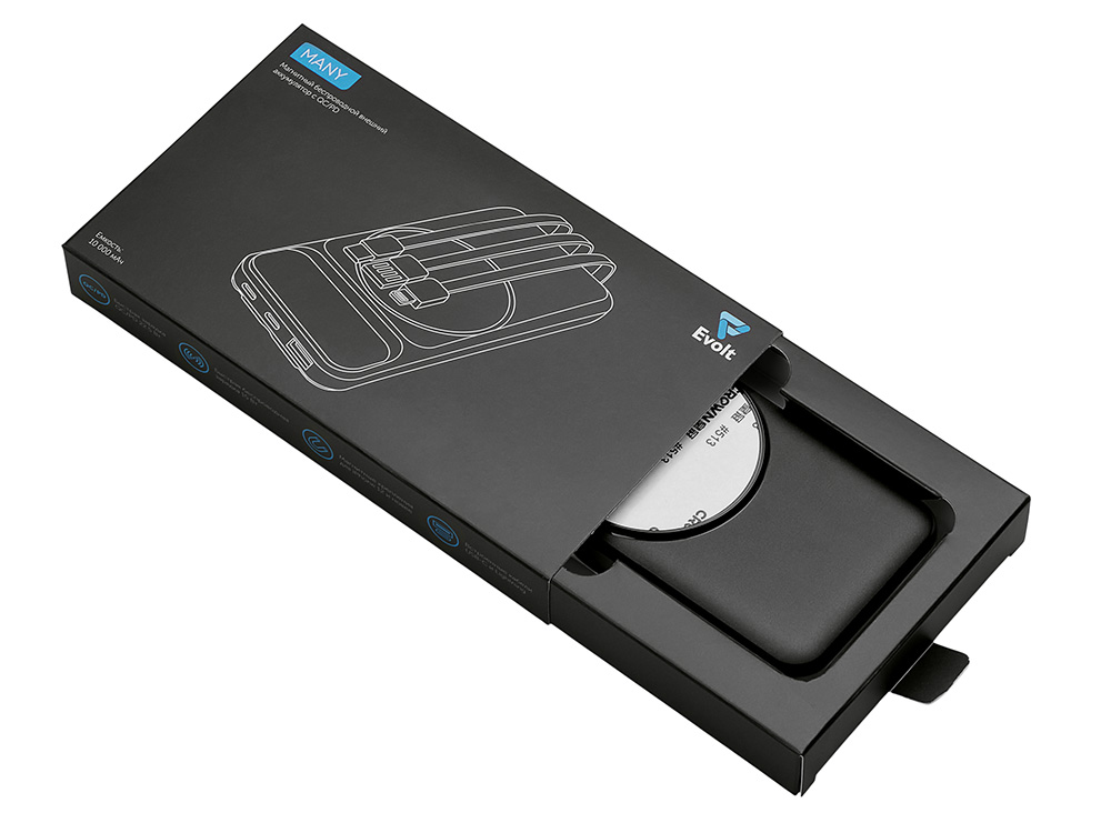 Функциональный и удобный внешний аккумулятор на 10 000 мАч обеспечивает быструю зарядку как по кабелям, так и беспроводным способом, поддерживая современные стандарты скорости. Цифровой дисплей на верхней панели мгновенно показывает точный уровень заряда, а встроенные кабели Lightning, USB-C и входной USB-A устраняют необходимость в дополнительных проводах — всё, что нужно для каждодневного использования, уже есть в самом гаджете. Компактные габариты, сопоставимые с размером смартфона, делают устройство идеальным для путешествий и повседневного использования. Сильные магниты гарантируют надёжное крепление при беспроводной зарядке. В комплекте есть силиконовая накладка: перед использованием удалите защитный стикер и прикрепите её к корпусу. - Встроенные кабели (Lightning, USB-C, USB-A) — не нужно искать дополнительные кабели: зарядка других устройств и подзарядка аккумулятора происходят через встроенные кабели. - Сильные магниты - Цифровой дисплей уровня заряда и статуса зарядки - Функции быстрой проводной и беспроводной зарядки - Упаковка с удобным и быстрым открытием