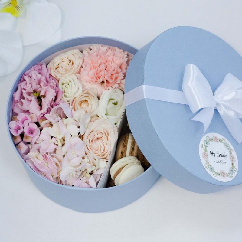 • Свежие цветы и вкуснейшие пирожные macarons в подарочной коробке
