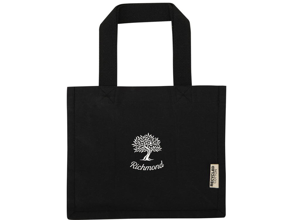 Мини эко-сумка Odessa с клинчиком, изготовленная из переработанного хлопка, сертифицированного согласно GRS, плотностью 220 г/м², объемом 9 л - сплошной черный купить оптом и в розницу с нанесением логотипа в Казани