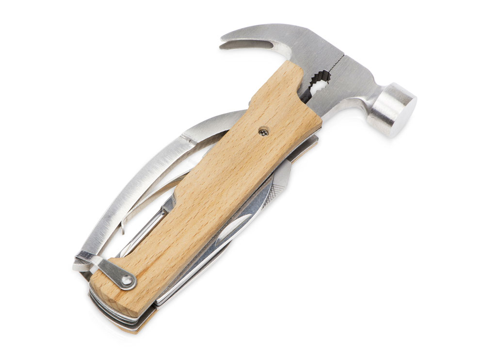 Многофункциональный инструмент, который выручит дома, на даче, в путешествии, походе и во множестве других ситуаций. Полностью сделан из металла и декорирован накладками из натурального дерева. Чехол в комплекте. Основные функции: - Молоток - Плоскогубцы - Гвозодер - Кусачки - Пила - Напильник - Нож - Открывашка - Отвертка (крестовая и плоская)