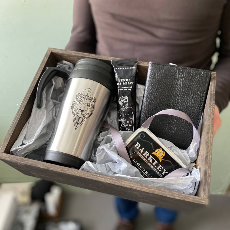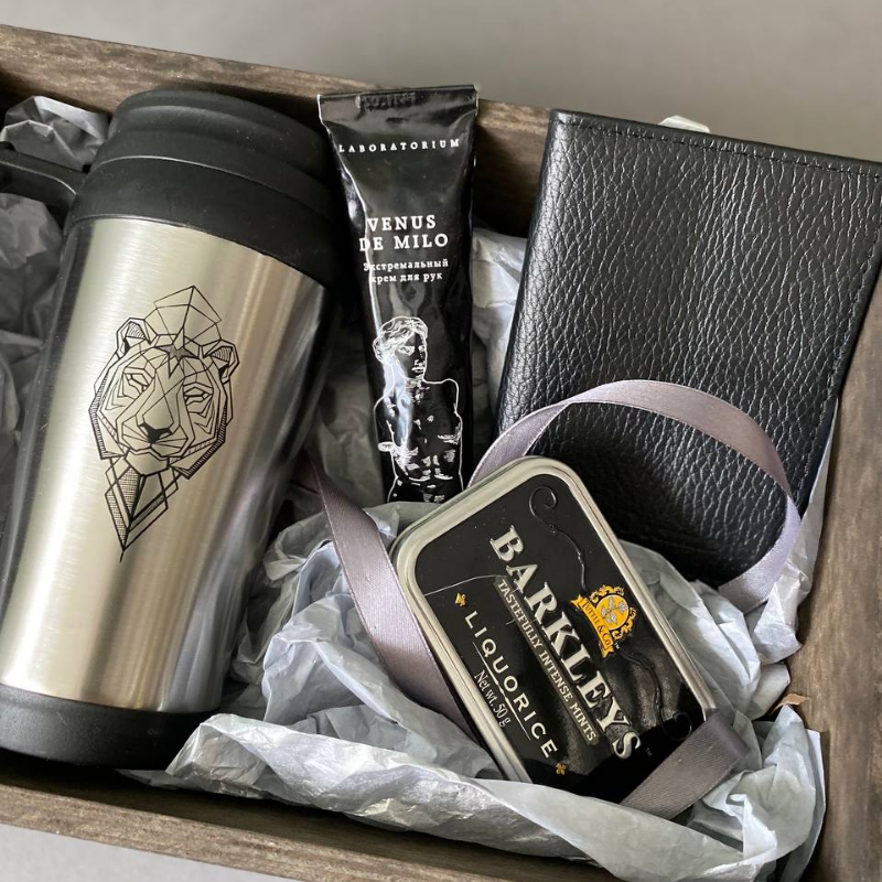 Состав обложка для автодокументов, термокружка, леденцы в жестяной баночке Barkleys, крем для рук Labaratorium, декор