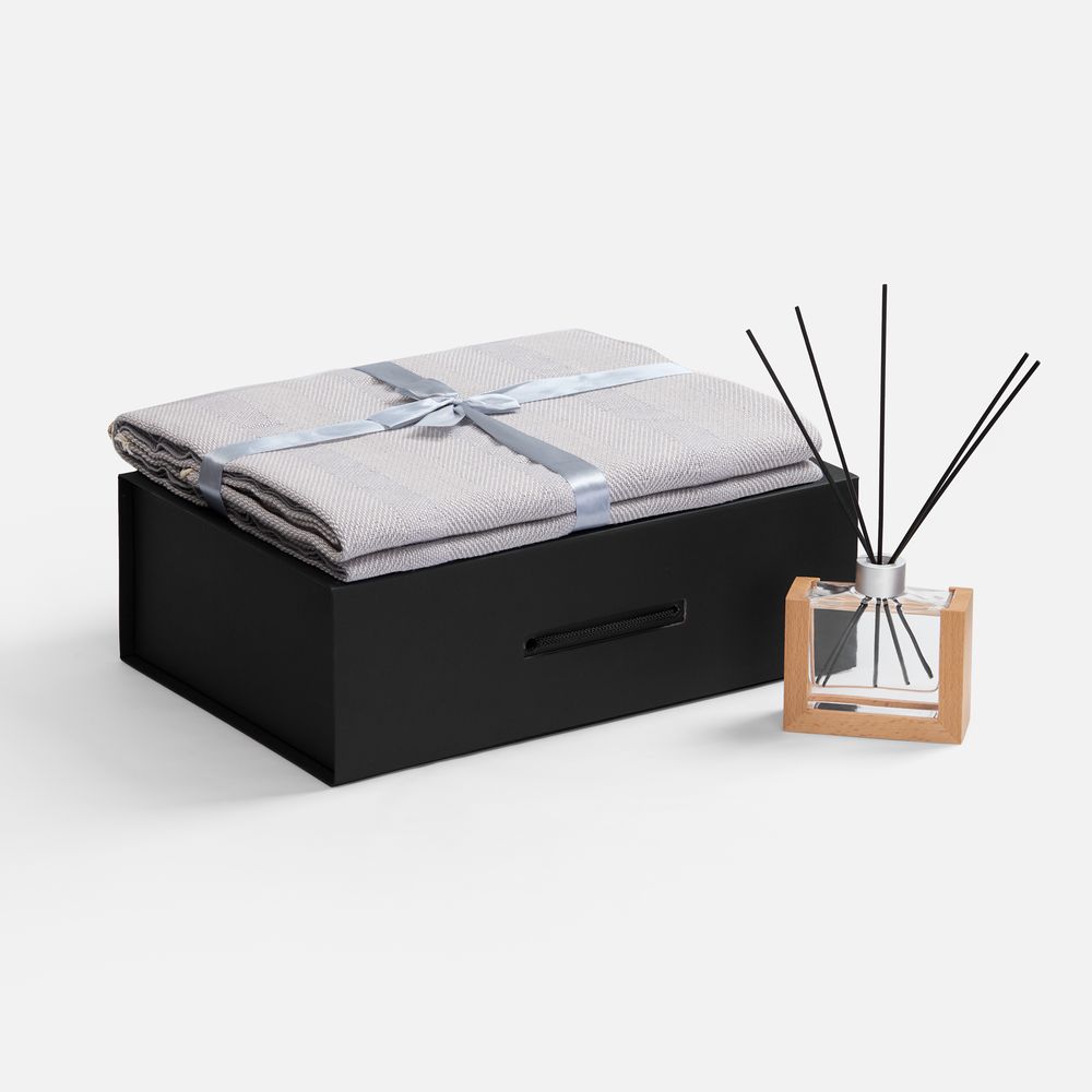 Материал флакон - стекло, палочки из файбера; подставка для флакона - дерево; плед - хлопок 95%, полиэстер 5%, плотность 300 г/м²; коробка - переплетный картон, бумага Malmero
