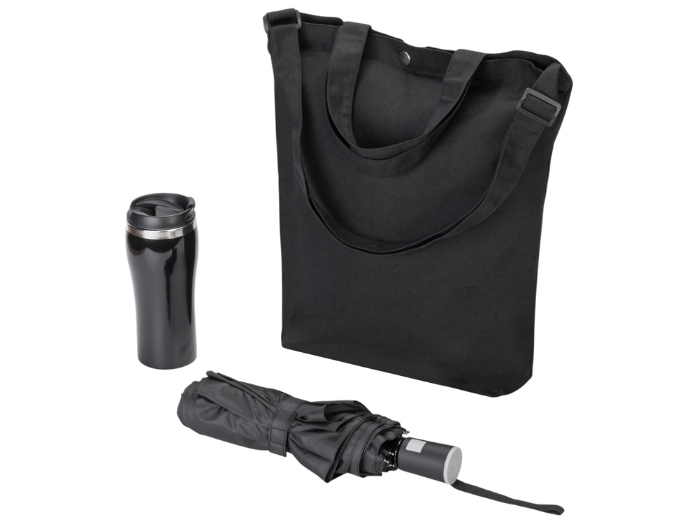 Набор для прогулок и шоппинга в любую погоду. На случай дождя предусмотрен зонт. Если на улице холодно, можно налить в кружку любимый согревающий напиток, а вместительная удобная сумка выдержит вес множества покупок. Сумку можно нести в руке или на плече для вашего удобства.