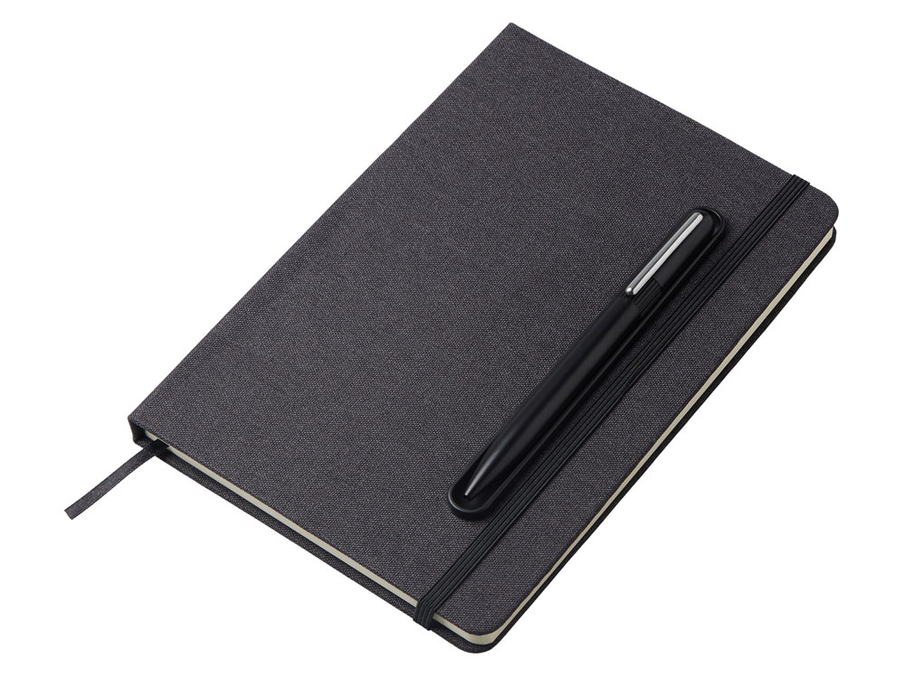 Блокнот в твердой обложке из rpet-пластика с металлической шариковой ручкой. В обложке магнитный держатель для ручки. Также верхняя часть обложки трансформируется в подставку для телефона. В блокноте 80 листов бумаги 70 г/м2.