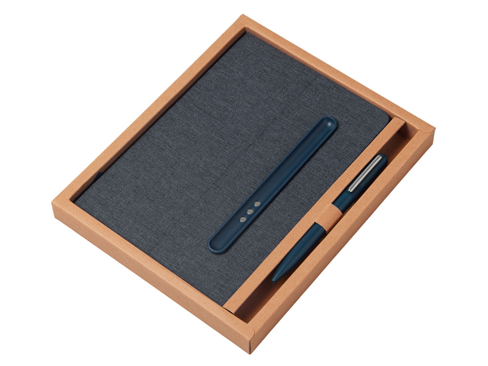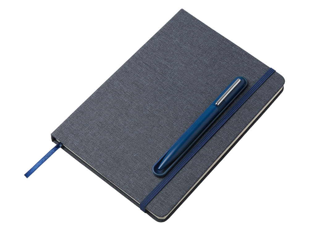 Блокнот в твердой обложке из rpet-пластика с металлической шариковой ручкой. В обложке магнитный держатель для ручки. Также верхняя часть обложки трансформируется в подставку для телефона. В блокноте 80 листов бумаги 70 г/м2.