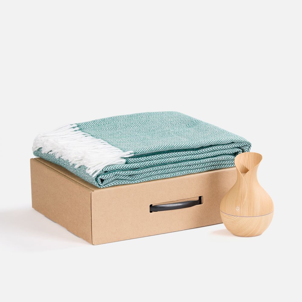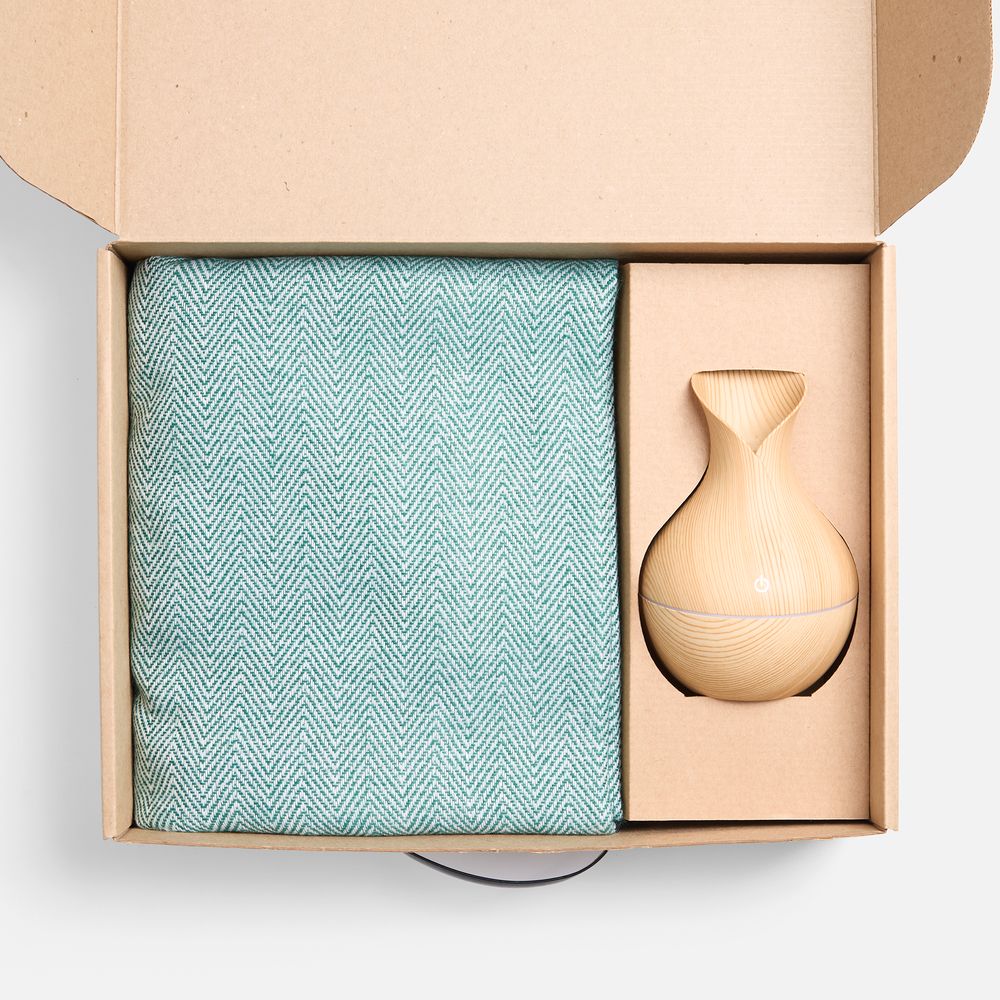 Мягкий плед нежных оттенков подарит тепло и комфорт, а изящный увлажнитель наполнит воздух свежестью и приятным ароматом. Этот набор — гармония красоты и функциональности, которая превращает каждый момент в отдых и восстановление.