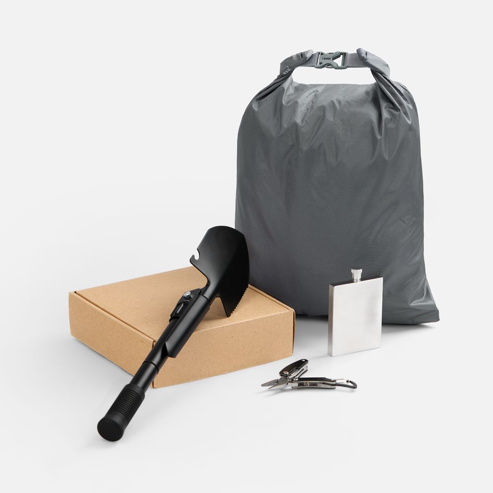 | Материал | лопата - сталь, пластик; резина; чехол - полиэстер; мультитул - нержавеющая сталь, алюминий; мешок - нейлон, рипстоп; полиуретан; фляжка - нержавеющая сталь, AISI 304; коробка - микрогофрокартон; наполнитель - бумага |