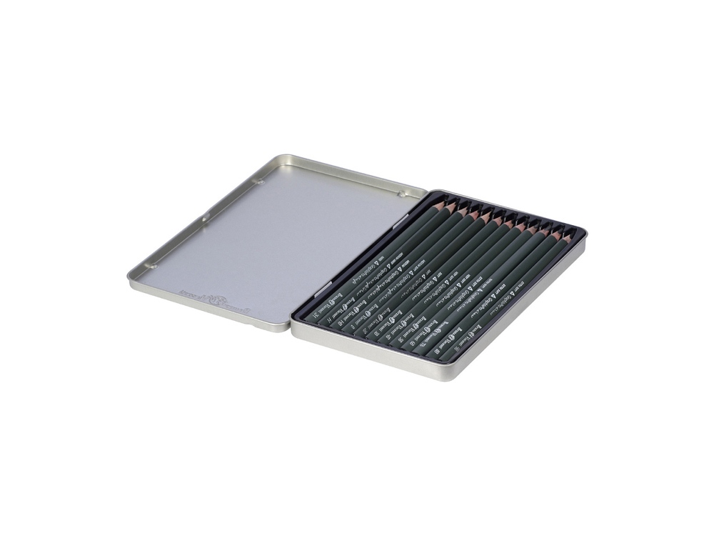 Комплектность 12 карандашей разной твердости (2H, H, HB, B, 2B, 3B, 4B, 5B, 6B, 7B, 8B, 9B), металлическая коробка