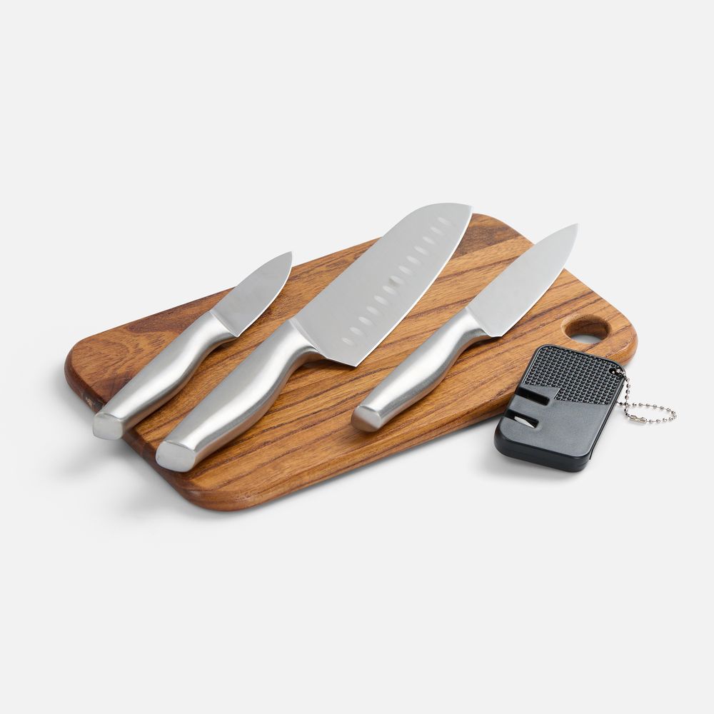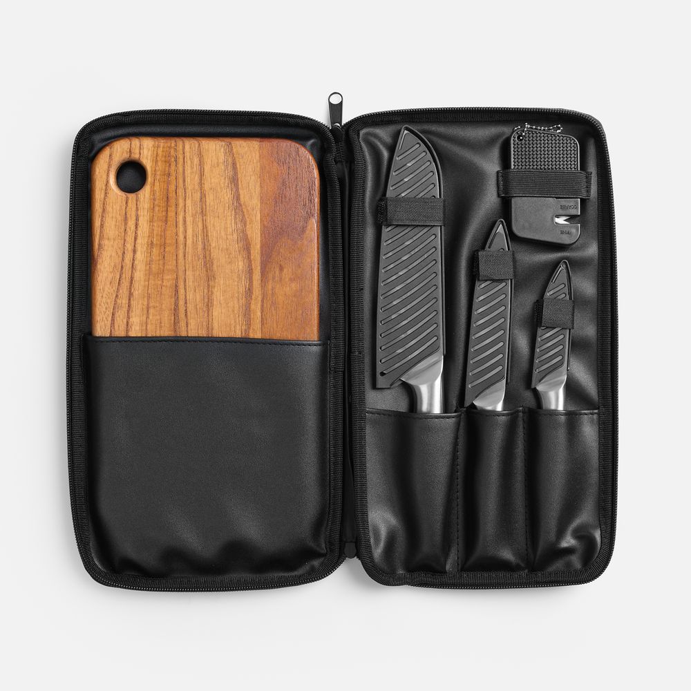 Этот компактный и стильный набор — как швейцарский нож в мире поварских инструментов: аккуратно упакован в лаконичную сумку и всегда готов к действию. Три ножа со сбалансированными лезвиями и прочная деревянная доска — персональный мясной арсенал. Можно забыть про неудобства и хаос: с Meateam на пикнике мясо будет под контролем профессионала.