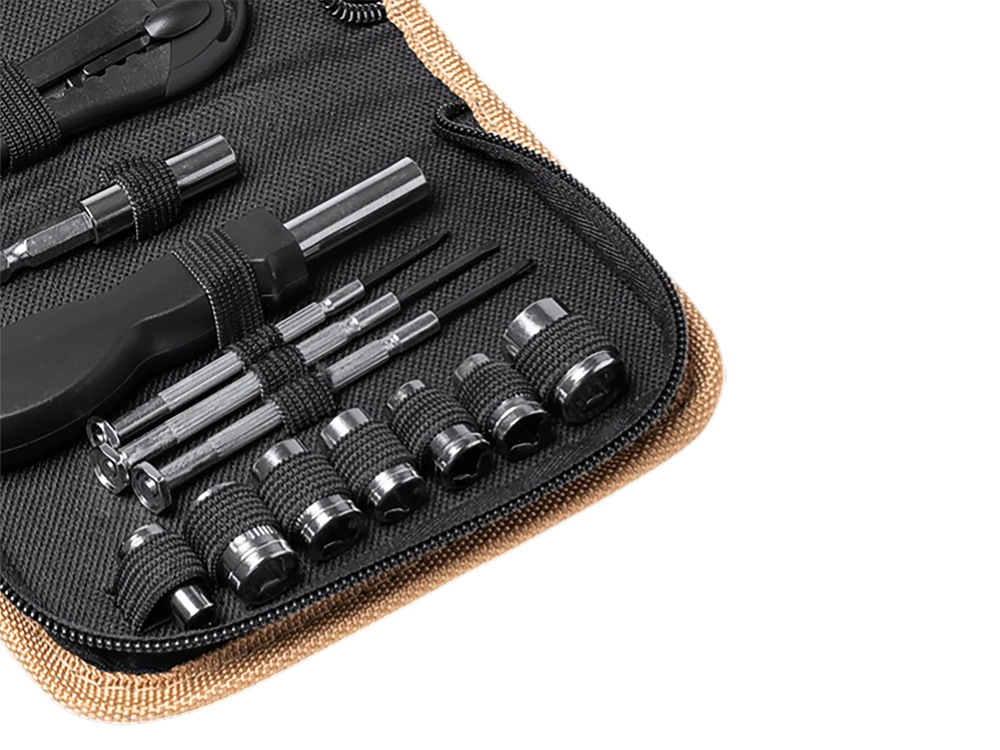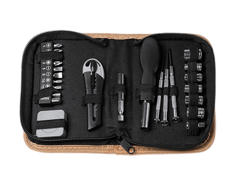 Набор инструментов из 25 аксессуаров. Канцелярский нож, шестигранные ключи, звездчатые и плоские отвертки, отвертка под разные насадки и рулетка 100 см. Набор поставляется в пробковом футляре.