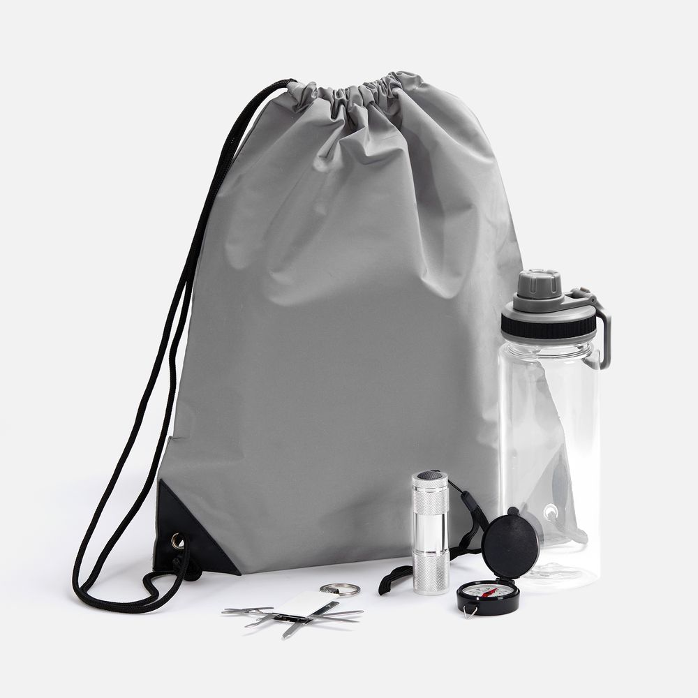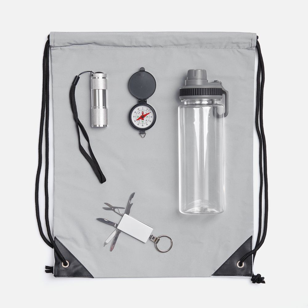 | Материал | рюкзак - полиэстер 35%, хлопок 65%; бутылка - пластик, пищевой; брелок-мультитул - металл; фонарик - алюминий; компас - АБС-пластик |