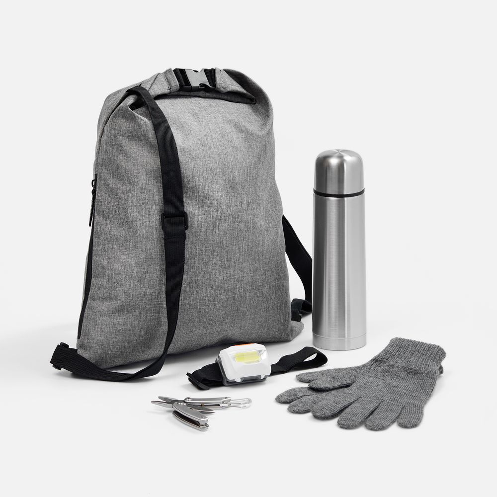 Материал перчатки - 50% шерсть, 50% акрил; фонарь - пластик; мультитул - нержавеющая сталь, алюминий; термос - нержавеющая сталь, 304 внутри, 201 снаружи; пластик; рюкзак - полиэстер, 300D
