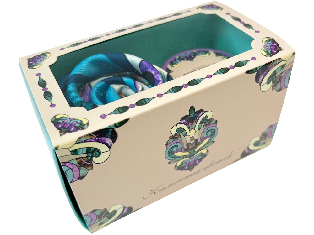 Красота Хозяйки Уральских гор издревле воспета сказаниями как воплощение неисчерпаемого источника вдохновения. Платок Каменный цветок открывает сокровищницу садов Хозяйки Медной горы. Заглавный образ навеян сказом о Каменном Цветке – символе творческого поиска и совершенства. Мозаика цветка содержит уральские самоцветные кристаллы аметиста и медного изумруда в обрамлении каймы узорчатого малахита. Ароматическая свеча Утонченность – это бодрящие ноты цитрусовых, фиалки и орхидеи, раскрывающиеся базовыми аккордами сандала и ванили. Дуэт создаст атмосферу созидания и праздничного воодушевления! Платок: 70% искусственный шёлк, 30% вискоза, 90х 90 см Свеча: натуральный соевый воск, парфюмерная композиция (объем 100мл/ 20 часов горения)