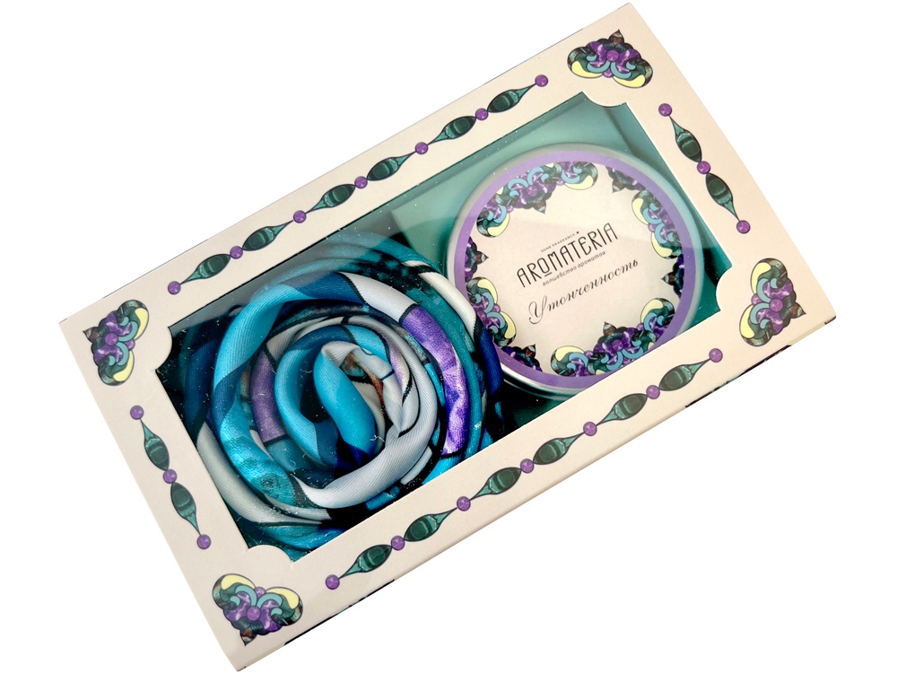 Материал товара платок- 70% искусственный шёлк, 30% вискоза, свеча- алюминий/натуральный соевый воск, парфюмерная композиция