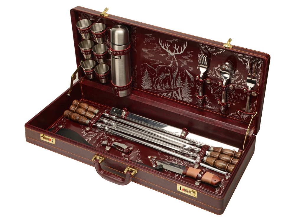 Кейс из сплит-кожи, с повышенной износостойкостью, внутренняя отделка натуральная кожа с художественным выжиганием. В комплект входит: Стопка d5,5 х 6 см - 6шт Термос d7 х 25 см - 1шт Вилка 19,5 х 2,5 х 2 см - 6шт Ложка 19,5 х 4,5 х 2,5 см - 6шт Вилка для барбекю 23 х 3 х 3см - 1шт Нож 26,5 х 4 х 2,5 см - 1шт Ножки для мангала 51 х 31 х 1 см - 2шт Шампур d3 х 65,5 см - 6шт Штопор 11 х 3 х 1см - 1шт Нож Проводник 47 х 8 х 3 см - 1шт