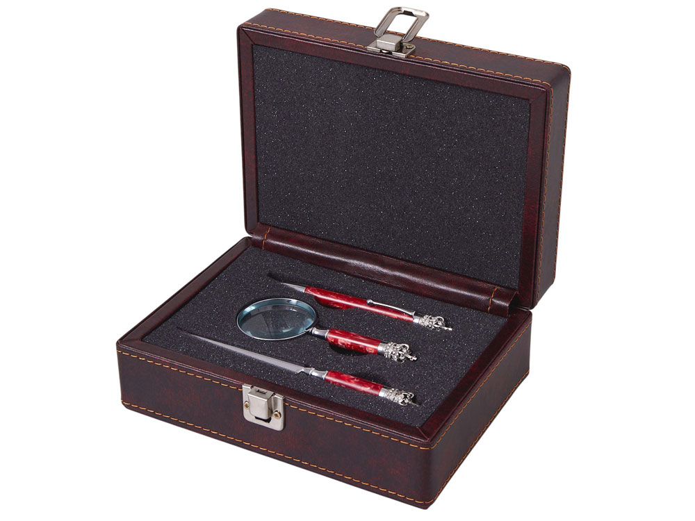 | Комплектность | ручка шариковая d1,1 х 13 см, лупа d5 х 12,1 см, нож для бумаг d1,1 х 16,5 см |