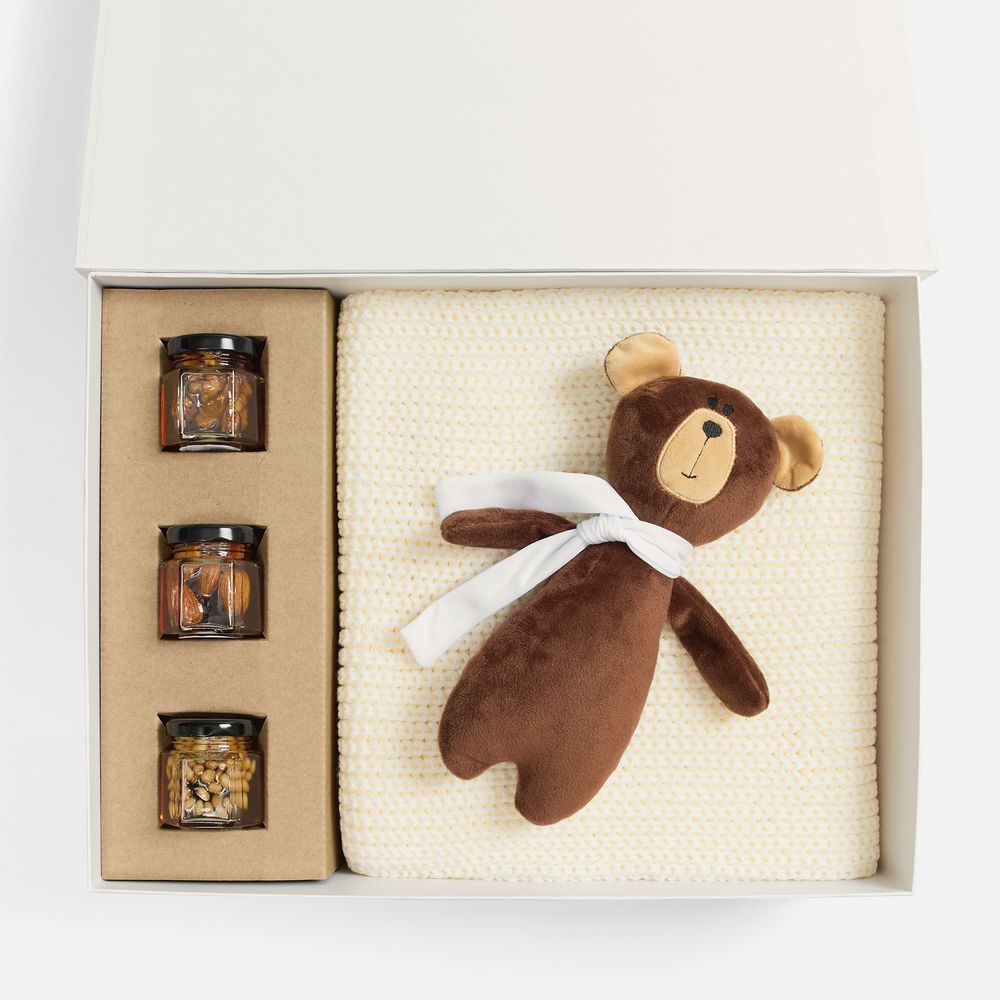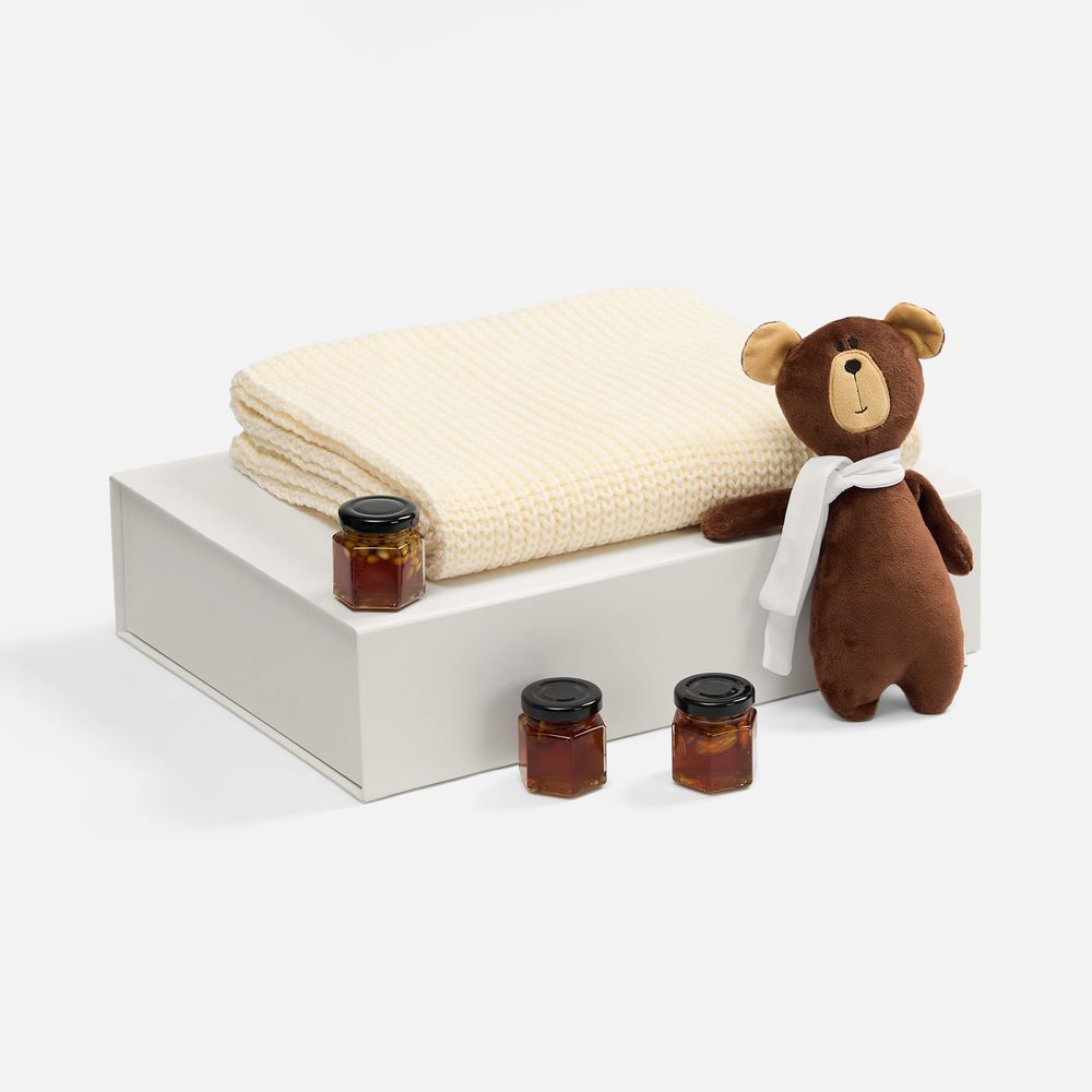 | Материал | шарф - акрил 100%; игрушка - велюр; набивка, шарфик - полиэстер 100%; баночки для меда - стекло; коробка - переплетный картон, бумага Majestic |