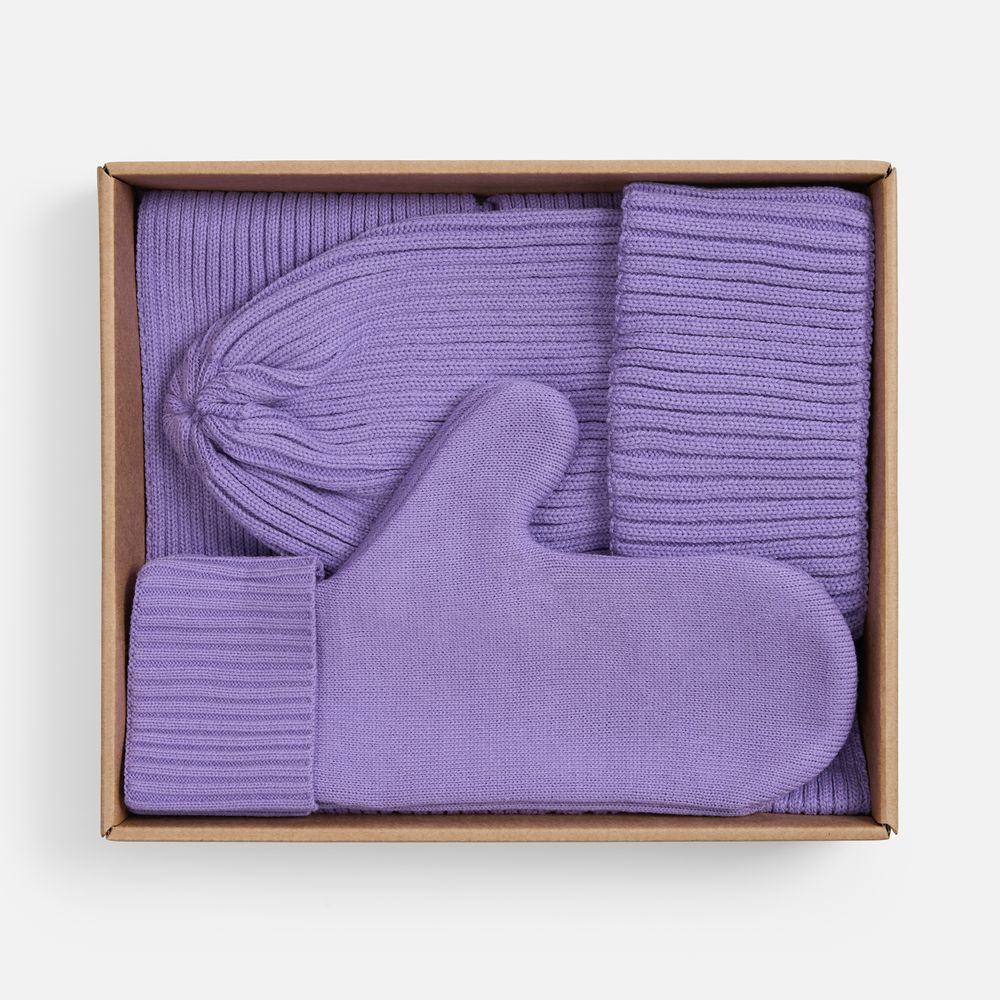 В набор входит удобный шарф с технологичным отверстием для быстрого завязывания, шапка с двойным отворотом и теплые двухслойные варежки с широкой манжетой. Все изделия связаны из акриловой пряжи, отличаются практичностью и элегантной простотой.