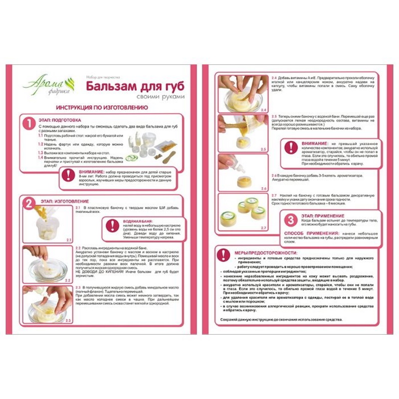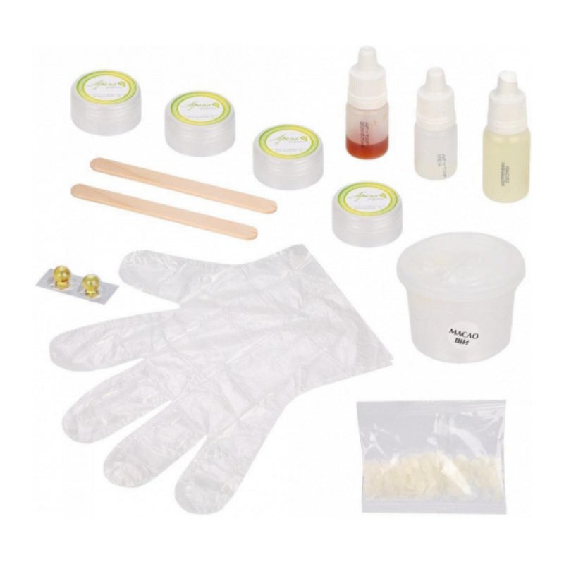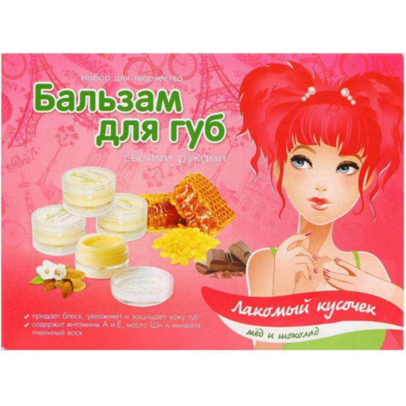| В комплекте | масло Ши, масло миндаля (косметическое), пчелиный воск, ароматизаторы пищевые (мёд и шоколад), витамины А и Е, ёмкость для перемешивания, палочки для перемешивания, перчатки, 4 баночки под готовый бальзам, наклейки, инструкция |