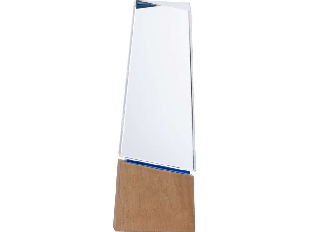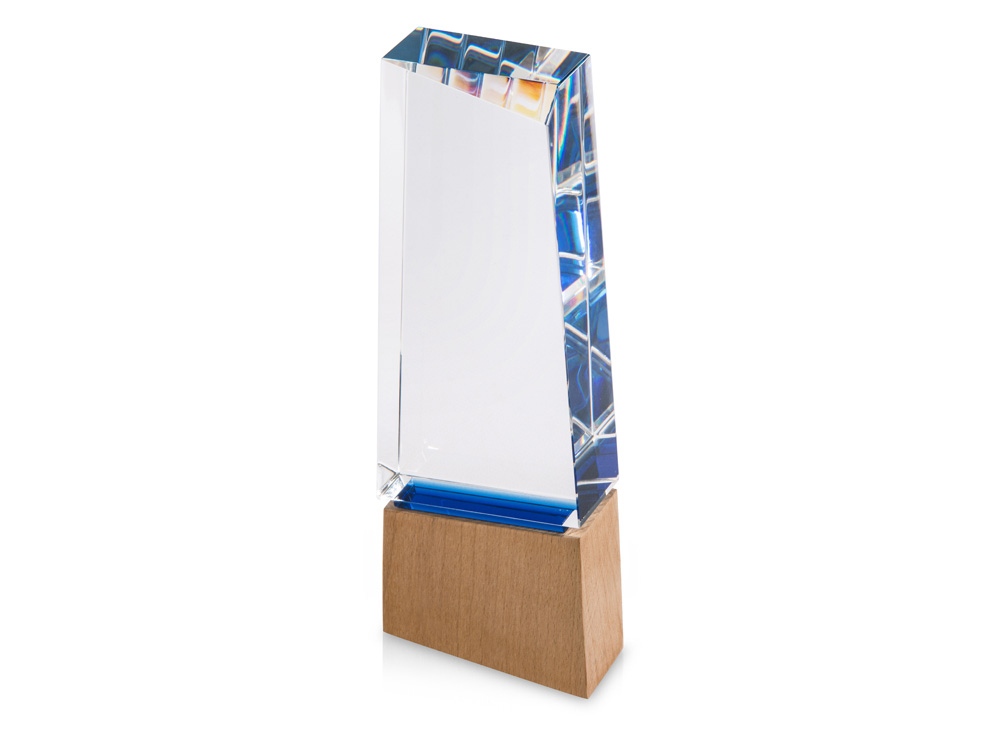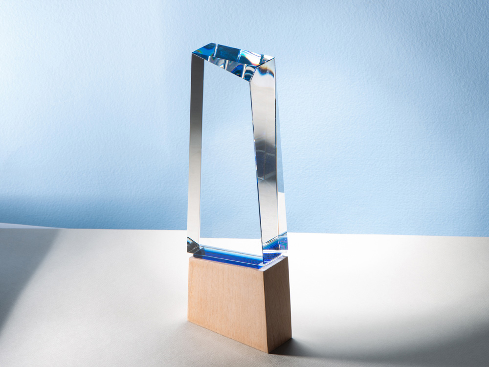 Награда выполнена из стекла, имеет необычную форму и расположена на деревянном постаменте. Лаконична и минималистична. Вставка из синего стекла между основной частью и основанием позволяет награде бликовать синим цветом в зависимости от угла падения света. • Строгий дизайн • Нестандартная геометрическая форма • Синяя стеклянная вставка между основной частью и основанием • Деревянная подставка