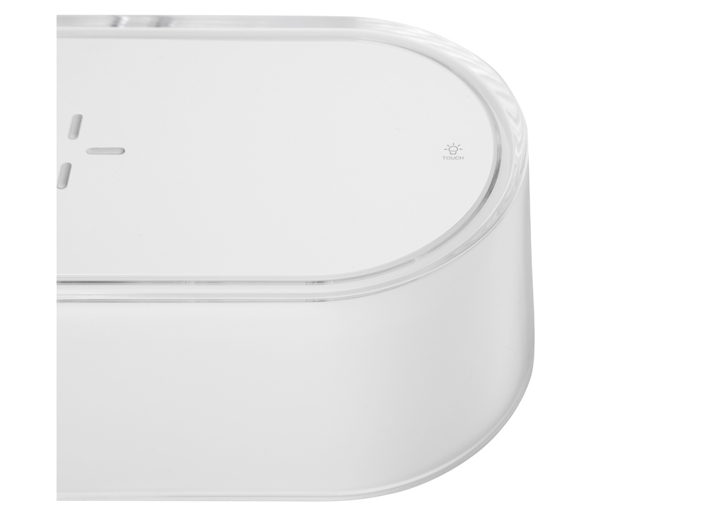 Ночник с RGB-подсветкой из 7 переливающихся цветов. Также есть режимы стандартного и яркого освещения теплым светом. Ночник выполняет функцию зарядной станции для устройств, поддерживающих беспроводную зарядку стандарта Qi мощностью 15 Вт*. Функция ночника работает без подключения к сети благодаря встроенному аккумулятору на 400 мАч. Функция беспроводной зарядки работает только при питании от сети. Устройство можно брендировать методом УФ-печати, тампопечати, а также цифровой печати. *при наличии сетевого адаптера 18 Вт, в комплект не входит. - быстрая беспроводная зарядка до 15 Вт - 3 режима работы подсветки - встроенный аккумулятор 400 мАч для работы ночника - удобная форма для нанесений