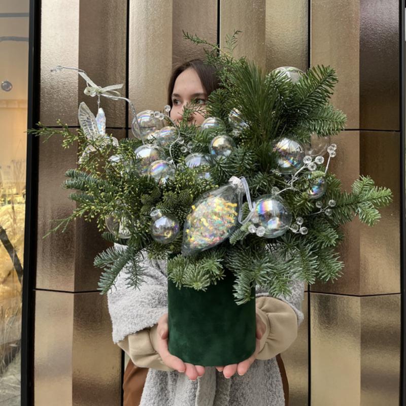 | Состав | композиция со свечами и елочными игрушками |