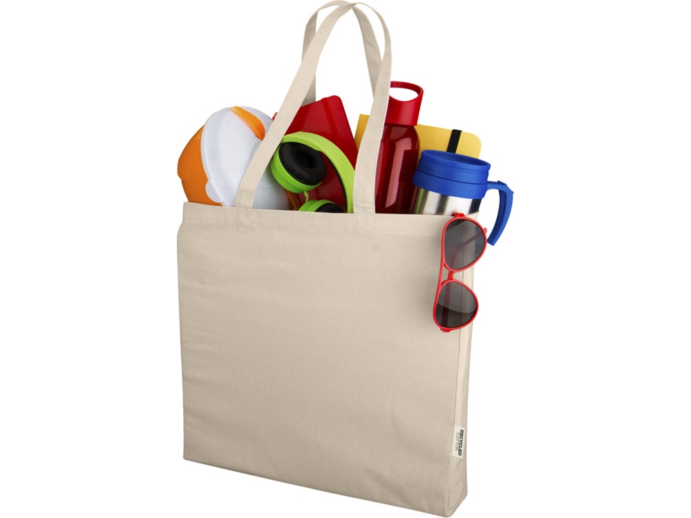 Эко-сумка Odessa, изготовленная из 100% переработанного хлопка, сертифицированного по стандарту GRS, создана для удобного ношения благодаря ручкам на плечо длиной 30 см и большому основному отделению с клинчиком. Независимо от того, хотите ли вы носить с собой тяжелые книги или продукты, эта сумка предназначена для удовлетворения любых потребностей. Методы печати, доступные для этой эко-сумки, также сертифицированы по стандарту GRS, что гарантирует прозрачность и сертификацию всей цепочки поставок. Хлопок плотностью 220 г/м² обеспечивает долговечность и надежность и позволяет переносить вес до 10 кг. Сделано в Индии. Recycled cotton, 220 g/m2.