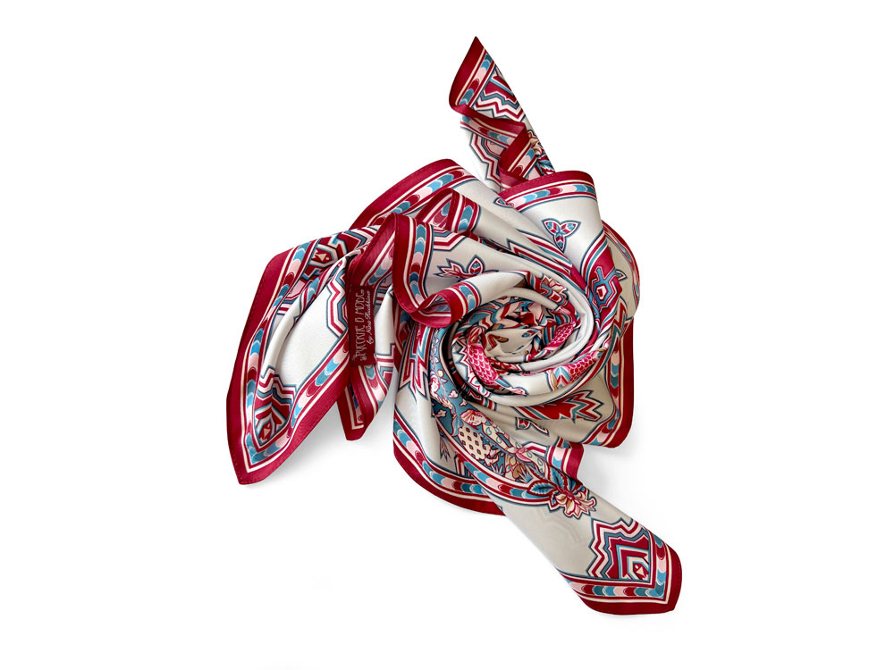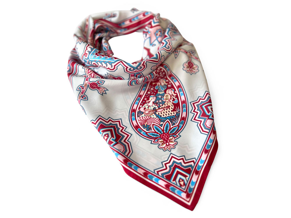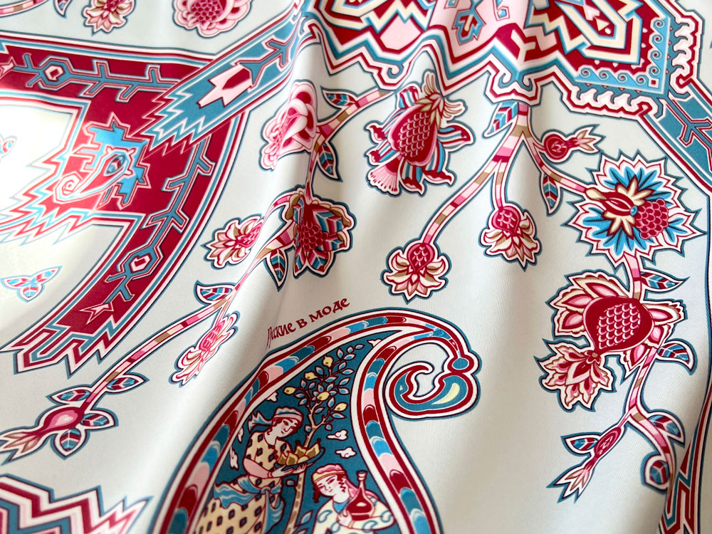 Дизайн платка Кавказский скакун от бренда Русские в моде by Nina Ruchkina навеян прекрасным и загадочным Востоком, вдохновляющим творцов всего мира. В центре принта аксессуара изображена гордая лошадь - один из главных символов величественного Кавказа, ассоциирующийся с дивной красотой, силой, смелостью и огнём. Изящный скакун окружён бутой - языками пламени, роскошными цветами плодородного граната, изящно простирающимися меж колоритного орнамента знаменитых восточных ковров. В каждом элементе буты можно увидеть национальные промыслы и традиционные музыкальные инструменты — лютню (удд), бубны, почитаемые народами дивного Востока. Этот платок идеально подойдет амбициозным, целеустремленным и уверенным в себе девушкам, стремящимся сделать каждый свой образ неповторимым! Дизайн: Нина Ручкина, Наталия Александрова.
