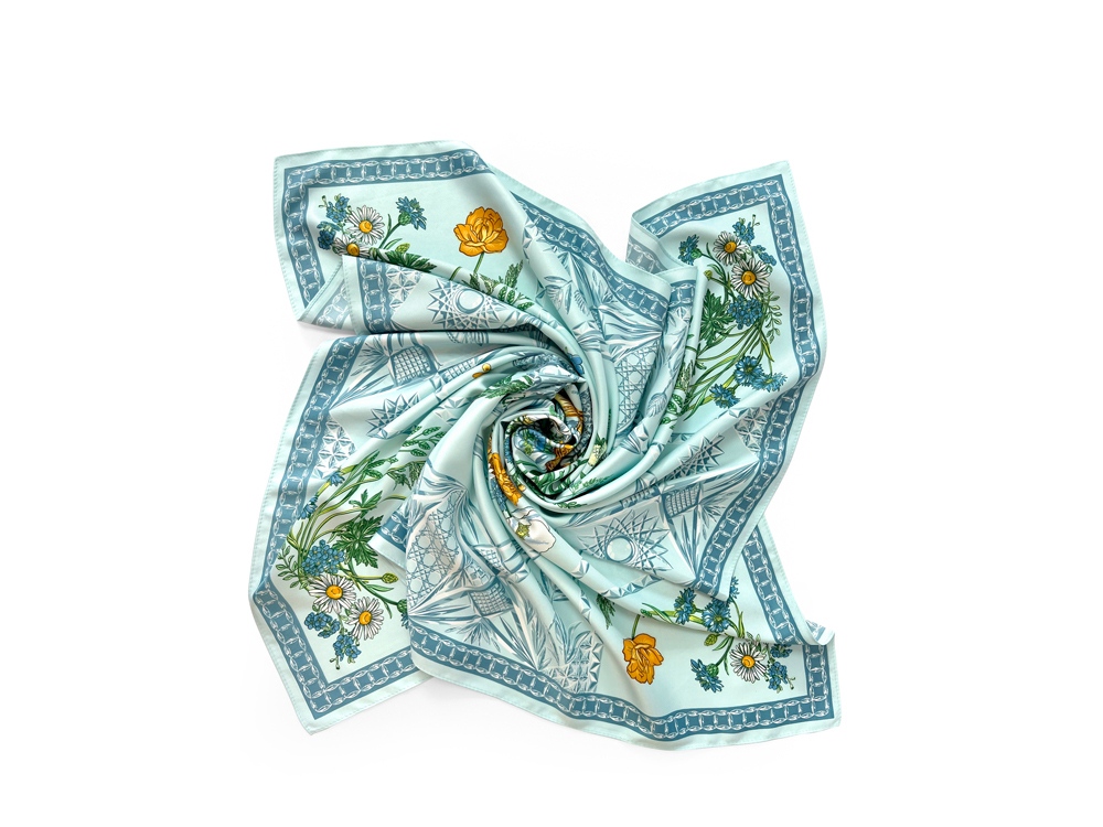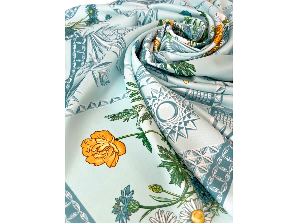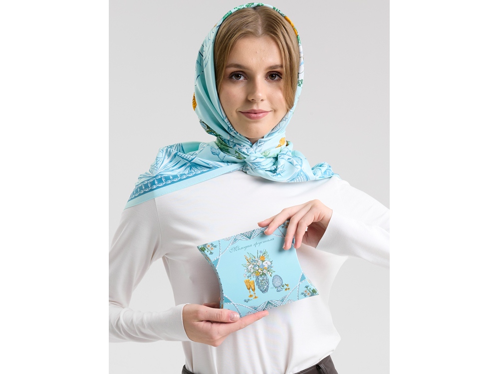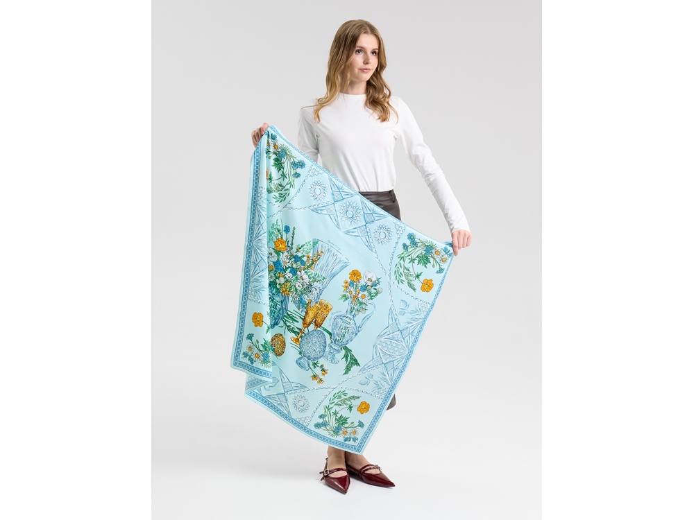 Платок Мелодия хрусталя создан в содружестве с легендарным Гусевским хрустальным заводом, выпускающим всемирно известные произведения искусства. Дизайн платка связан со стилевой эстетикой советской школы натюрморта. Перед нами ажурная скатерть стола, декорированного композицией из хрусталя и полевыми цветами. Нежные переливы сине-голубых тонов подчеркнуты ярко-желтыми и белыми бутонами, стеблями сочных трав и золотистыми бокалами. Ажур скатерти вторит хрустальному узору фужеров, ваз и сувенирных пасхальных яиц, задавая душевное настроение. Вам обязательно захочется насладиться вдохновляющей нотой платка Мелодия хрусталя и сделать его главным акцентом вашего образа.