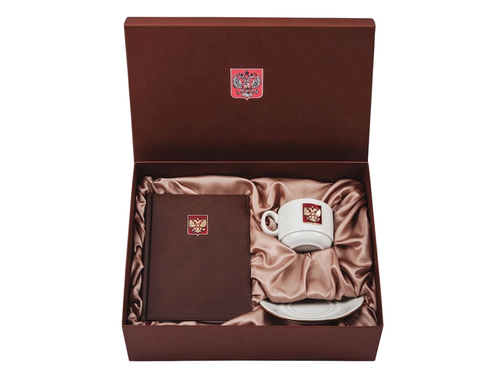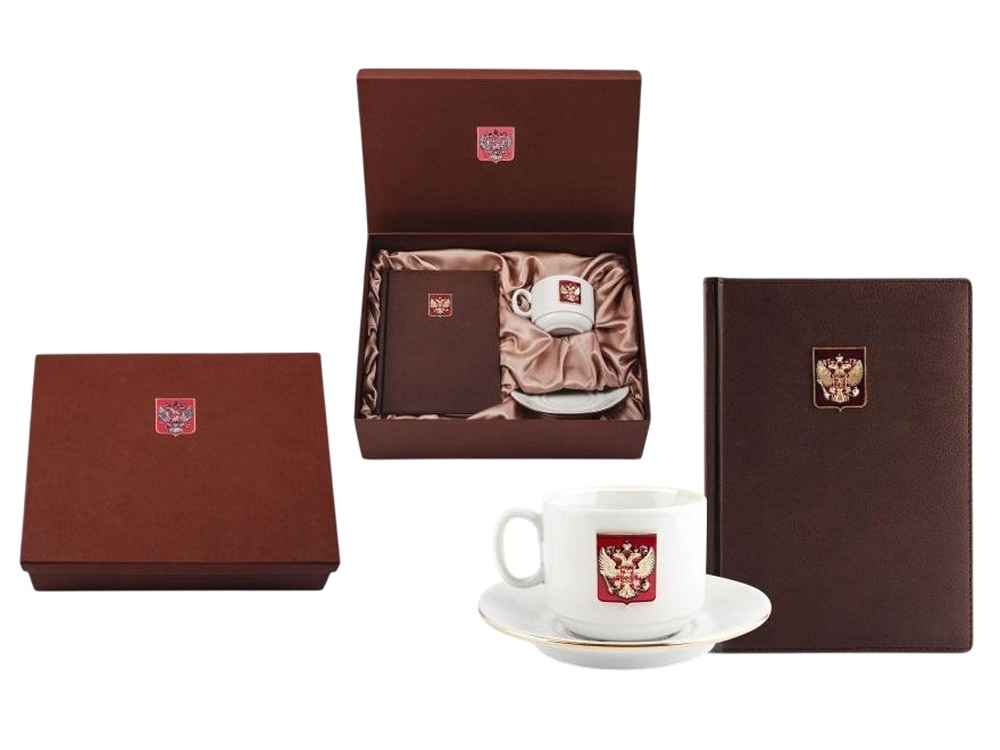 Подарочный набор с ежедневником и чайной парой. Ежедневник формата А5 с декором Герб РФ на щите и фарфоровая чайная пара с золотой отводкой края чашки и блюдца декорированная металлическим барельефом Двуглавый орел. Материал барельефа сплав алюминия с декоративным покрытием под серебро и отделкой эмалью, мартериал ежедневника кожзам. Емкость чашки 220 мл. Ручная работа. Подарочная упаковка.